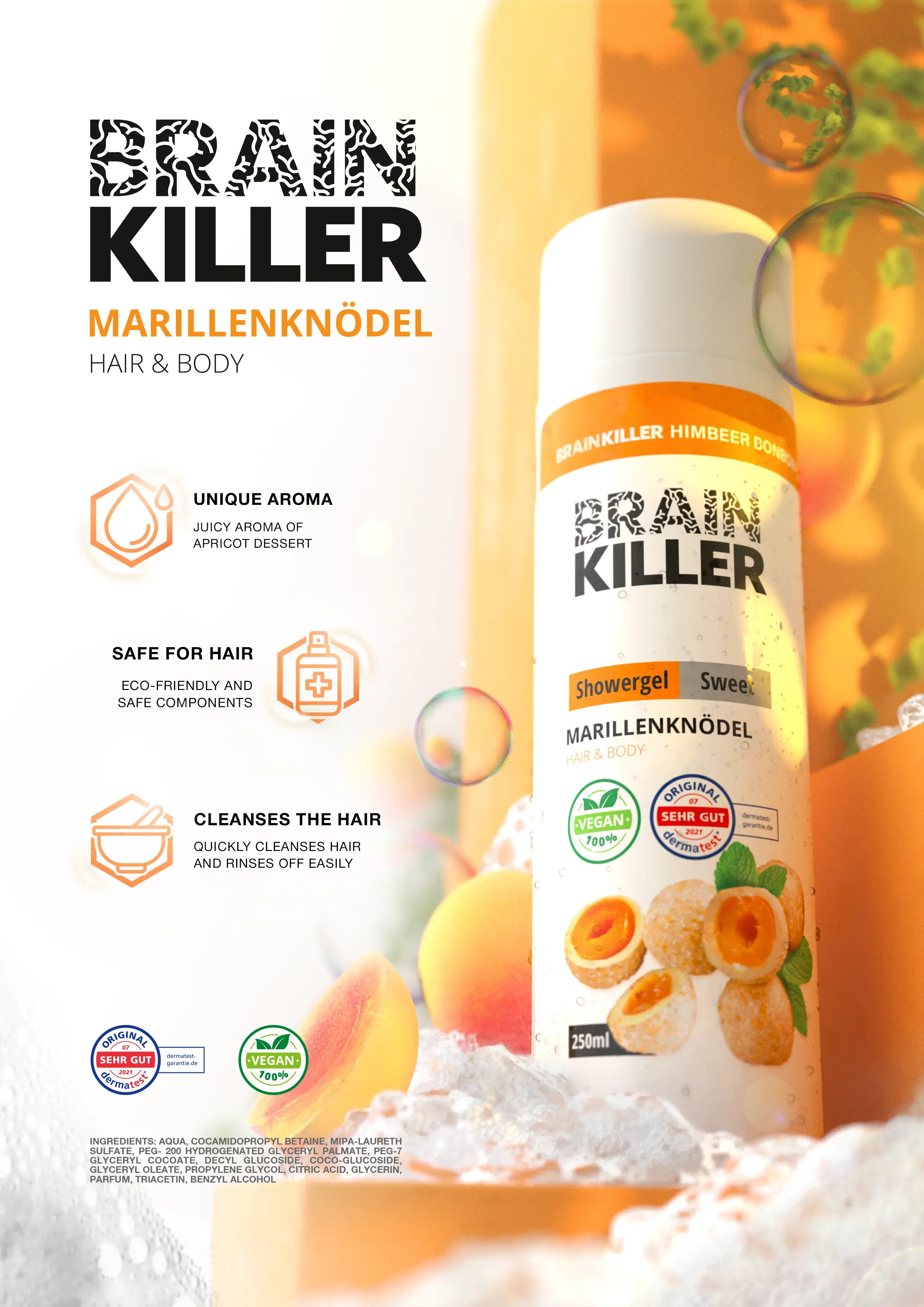 Brain Killer is a natural hair and body care brand in 2-in-1 format (shampoo + shower gel) Three scents: Himbeer Bonbon (raspberry + sweets), Mango-Vanille (mango + vanilla), Marillenknödel (apricot dessert) Formula: 98% natural ingredients, sulfate-free, paraben-free, vegan, cruelty-free Size: 250 ml, convenient pump packaging, suitable for the whole family Focus: quick cleansing, hydration, and pleasant scent without irritation