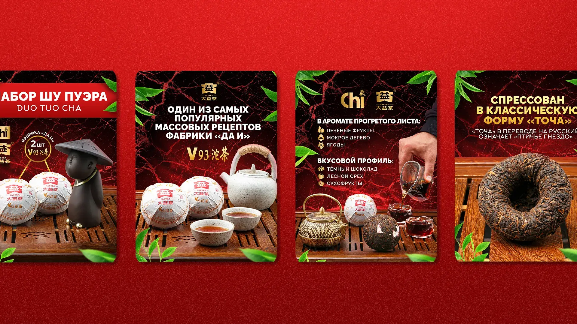 The developed product cards for Shu Puer V93 effectively convey the tea ceremony atmosphere and highlight the product’s unique characteristics. Infographics showing aromas and flavor profile helped customers navigate the offering more easily, while the red-black palette with marble background made the cards stand out on marketplaces and social media. The 5-slide carousel provided a complete product presentation, increasing audience engagement and boosting click-through rates.