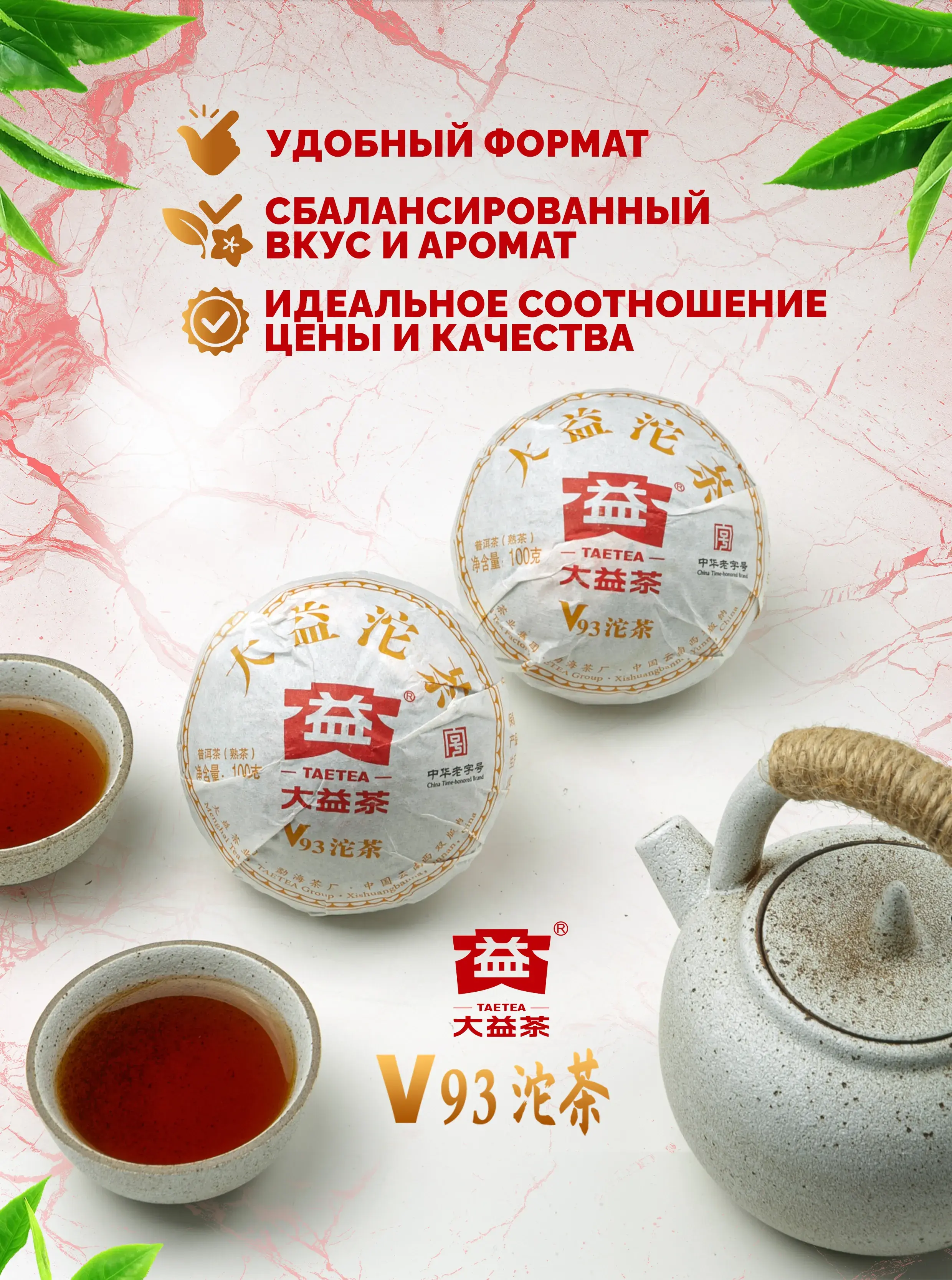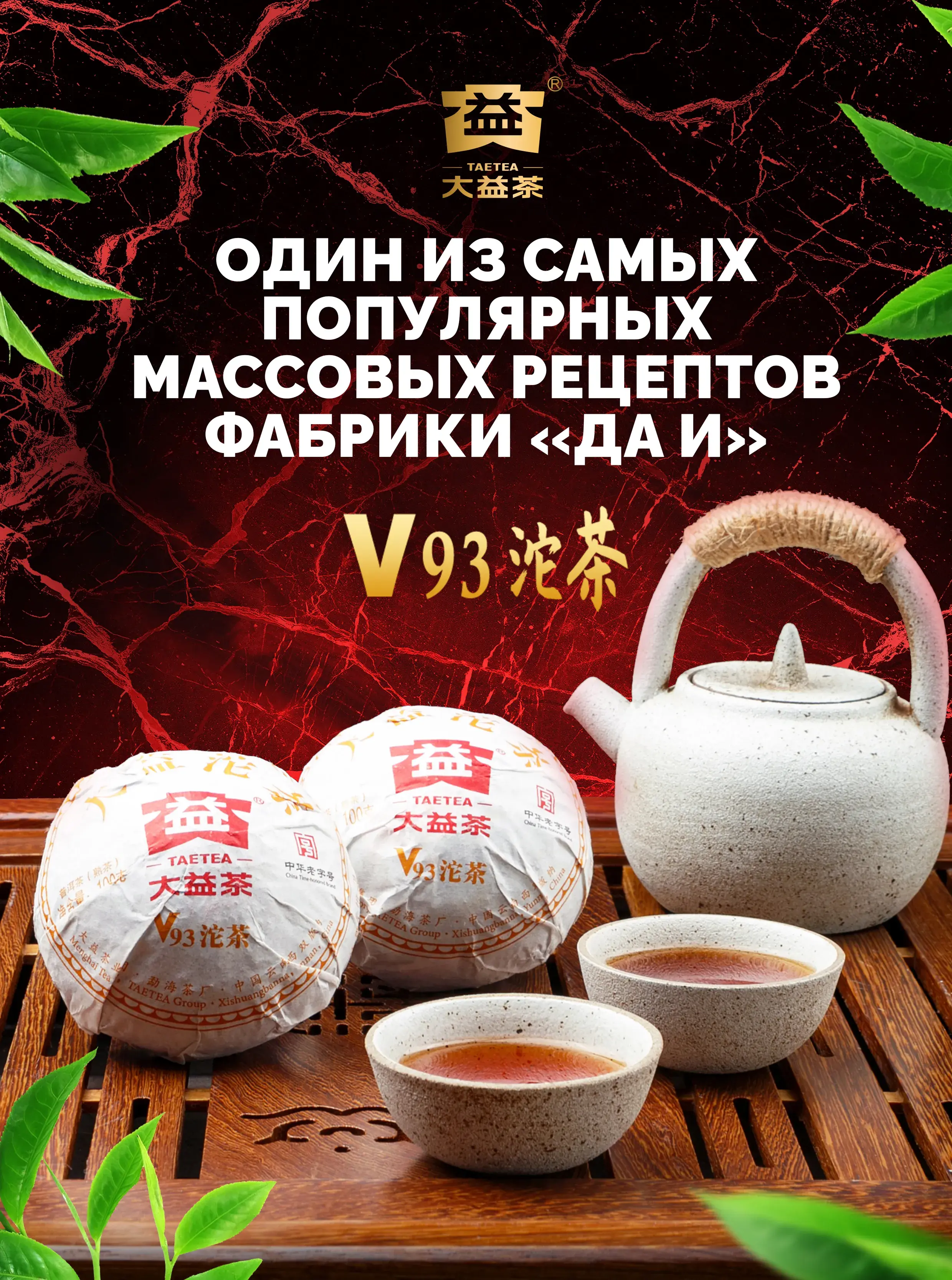Marketplace product card design for premium CHI V93 tea (Da Yi) — shu puer set in classic “tocha” form, highlighting factory authenticity, aroma, and flavor profile.