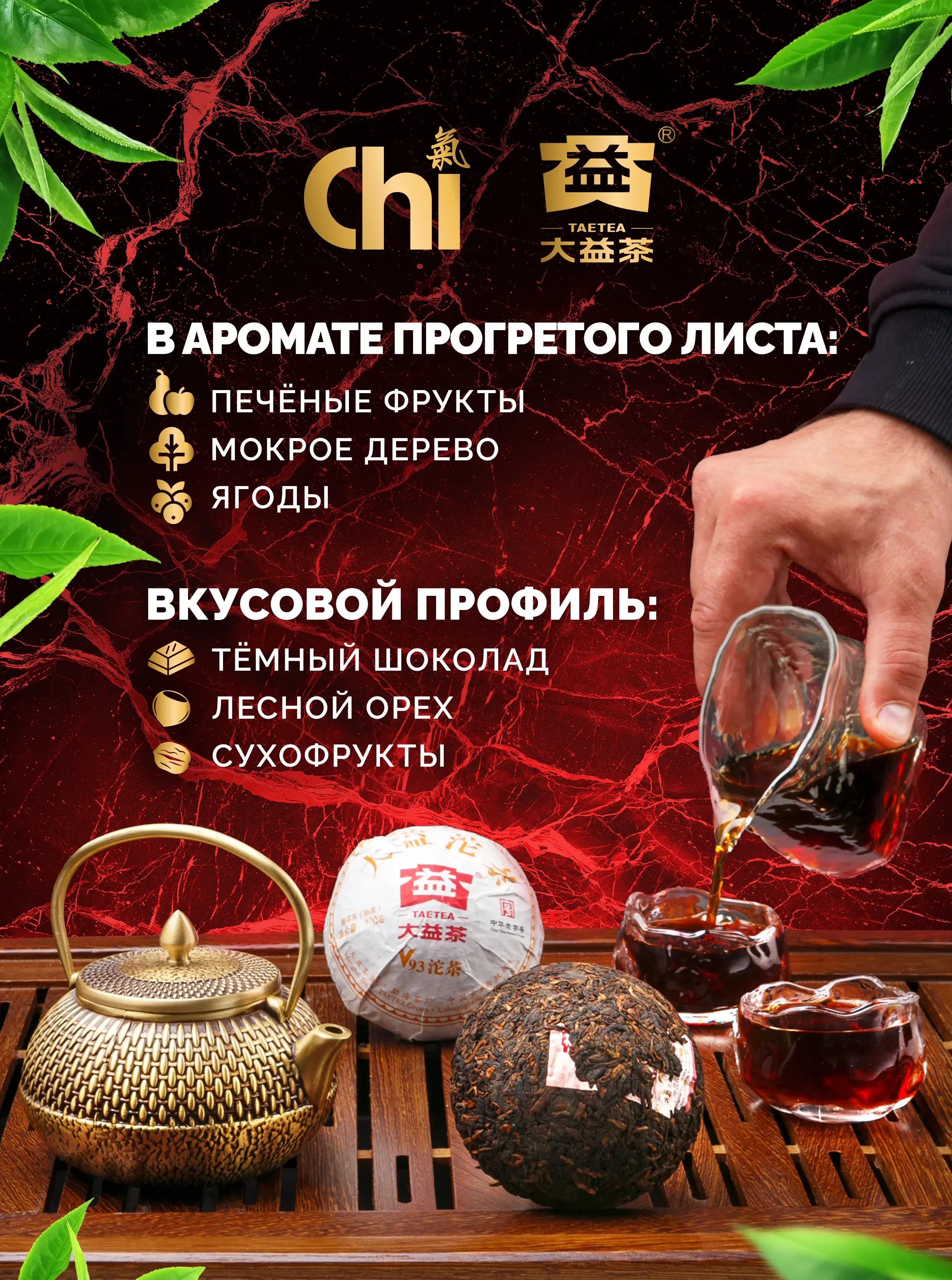 CHI is a premium Chinese tea brand from “Da Yi” factory (Dayi), founded in 1940 in Yunnan Province V93 — one of the most popular mass-produced shu puer recipes, pressed into “bird’s nest” (tocha) form Weight: 2 pcs of 93 g each, wrapped in traditional paper with 大益茶 hieroglyphs Aroma: baked fruits, wet wood, berries Taste: dark chocolate, hazelnut, dried fruits Available on Wildberries, Ozon, tea marketplaces