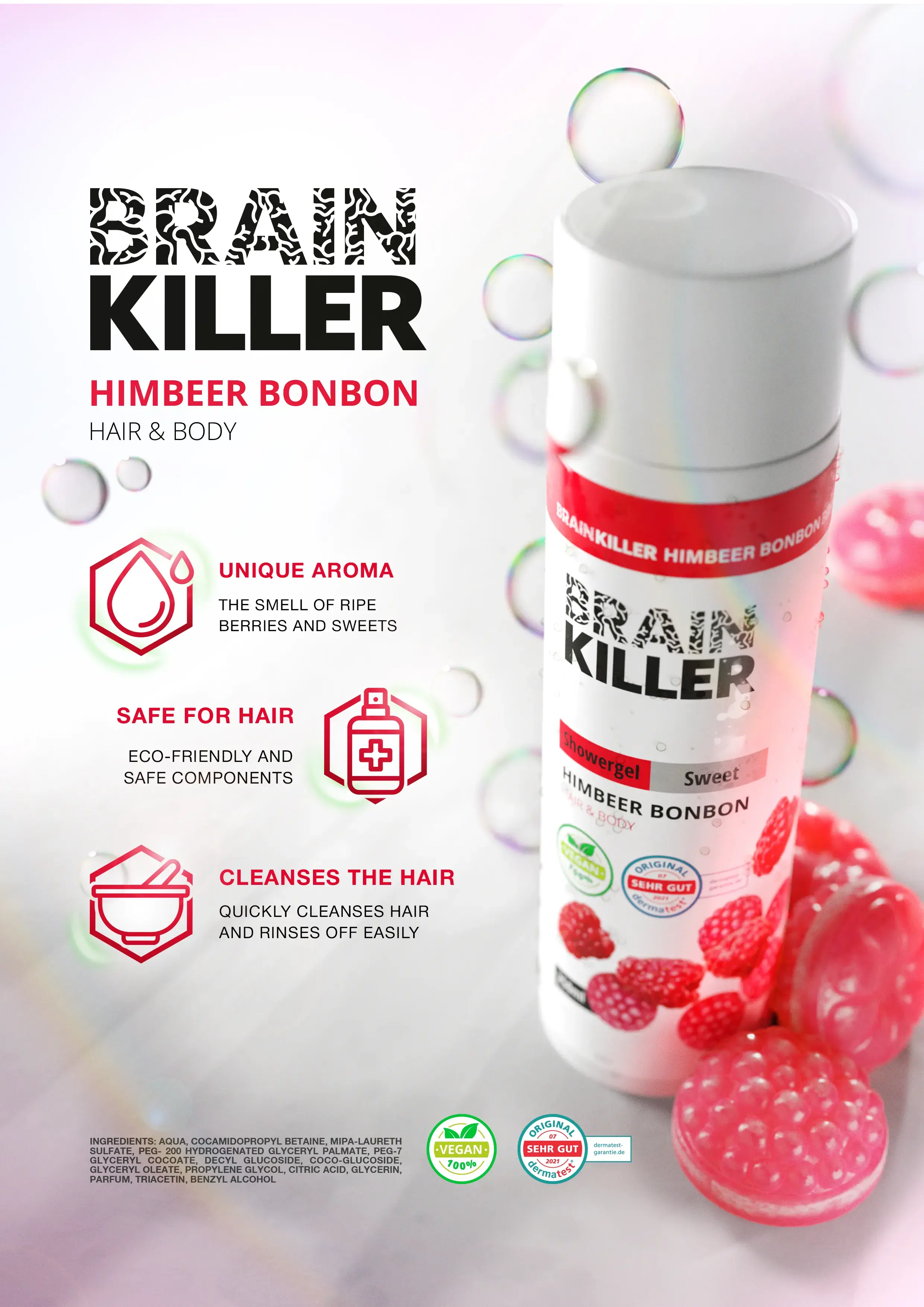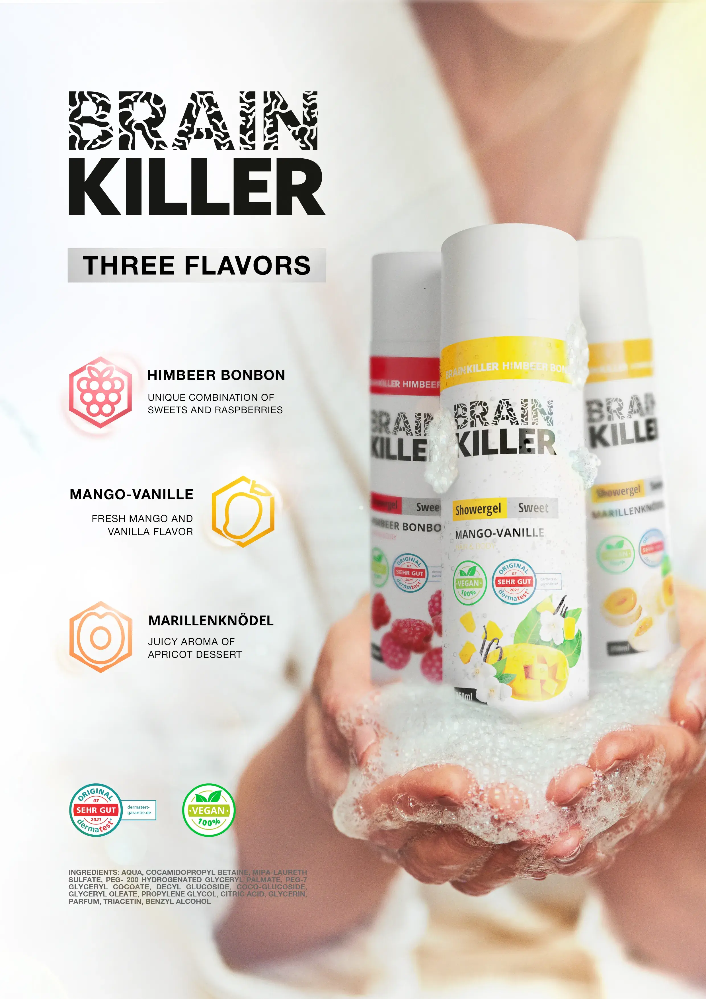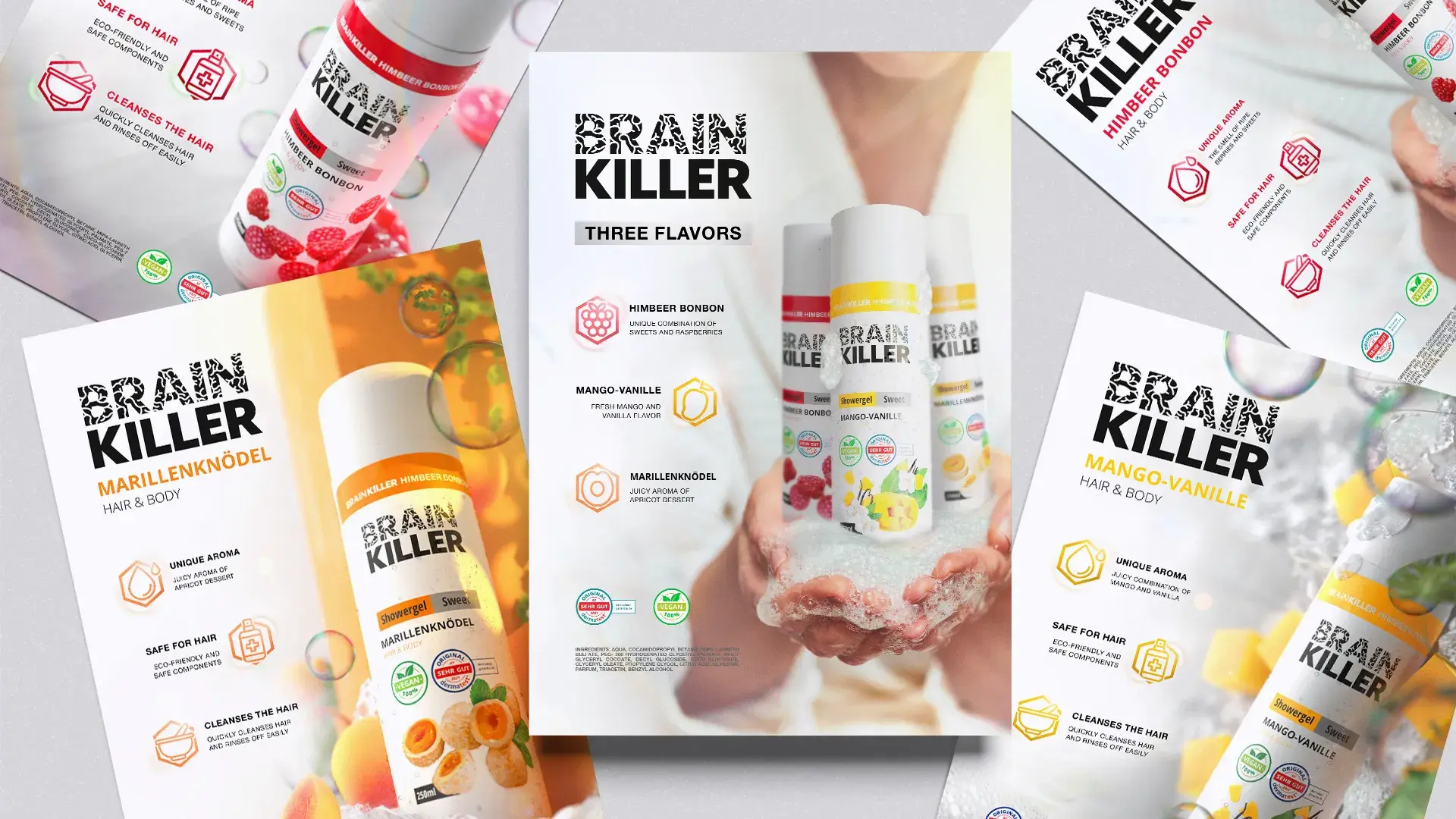 Brain Killer is a natural hair and body care brand in 2-in-1 format (shampoo + shower gel) Three scents: Himbeer Bonbon (raspberry + sweets), Mango-Vanille (mango + vanilla), Marillenknödel (apricot dessert) Formula: 98% natural ingredients, sulfate-free, paraben-free, vegan, cruelty-free Size: 250 ml, convenient pump packaging, suitable for the whole family Focus: quick cleansing, hydration, and pleasant scent without irritation