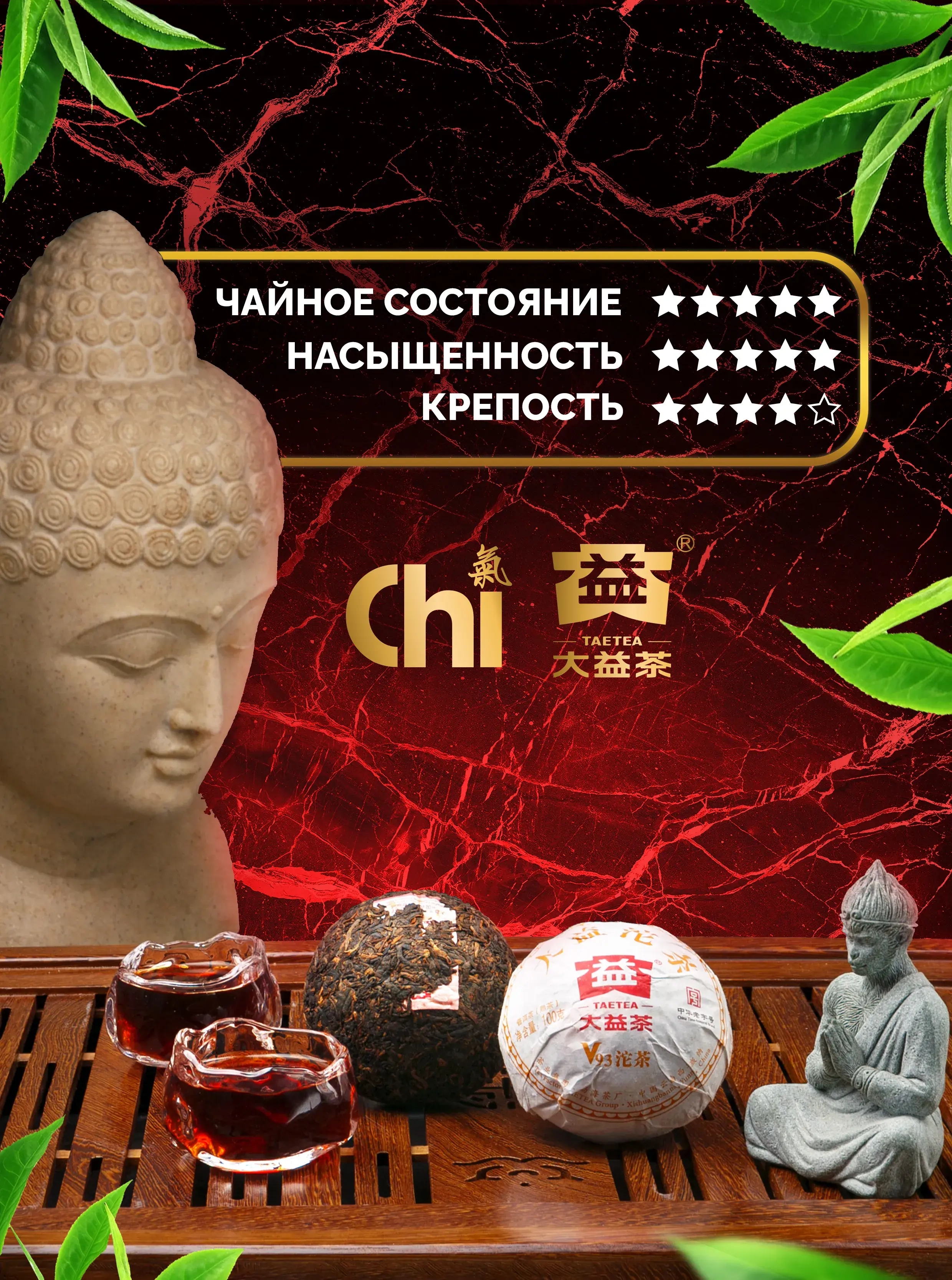 Marketplace product card design for premium CHI V93 tea (Da Yi) — shu puer set in classic “tocha” form, highlighting factory authenticity, aroma, and flavor profile.