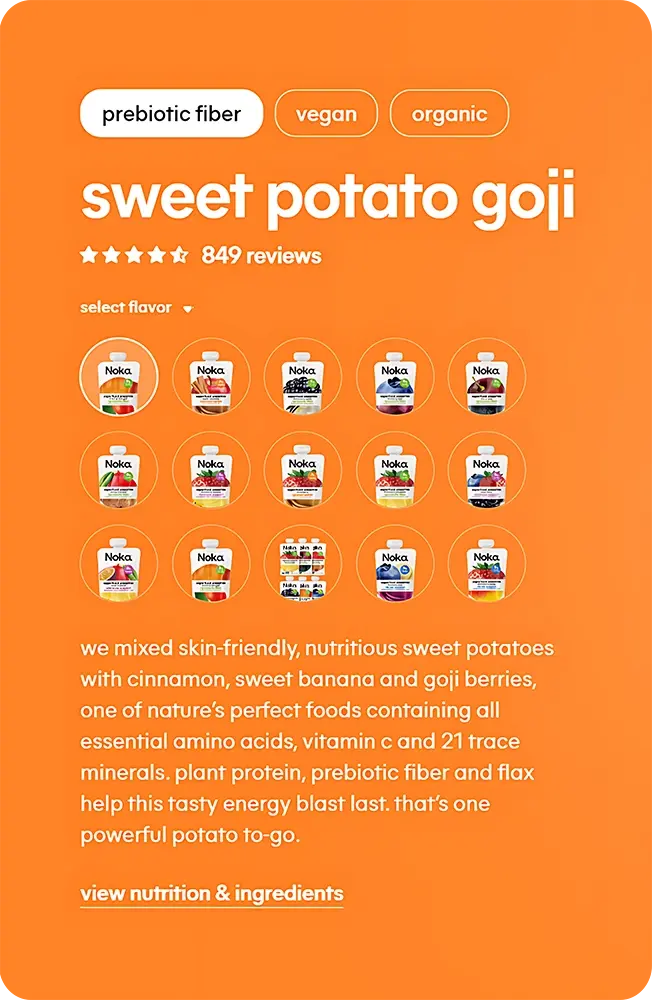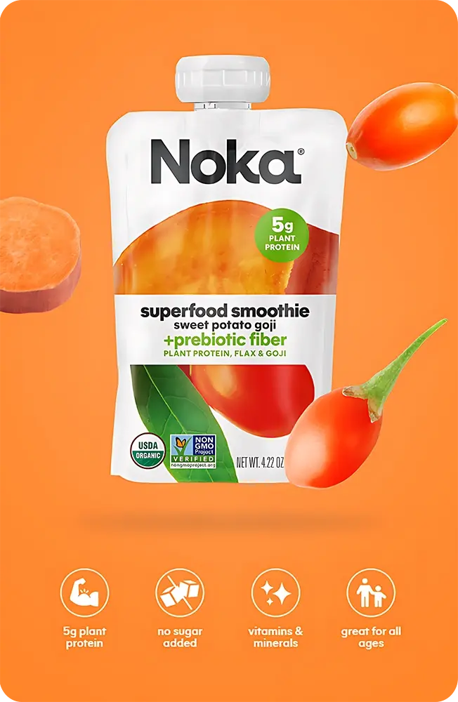 Noka Organics is a brand of organic superfood smoothies in convenient pouch format, blending taste, freshness, and nutrition Products: portable pouches with superfoods, organic ingredients from non-GMO farms, picked at peak ripeness Uniqueness: certified organic ingredients, upcycled fruits and veggies, sealed-in freshness, no dry bars Assortment: vibrant flavors (Variety Pack with top sellers), for quick snacks Noka focuses on simplicity, real deliciousness, and nutrition, available in stores and subscription Tagline: “Ditch the dry bar — a new kind of super snack”